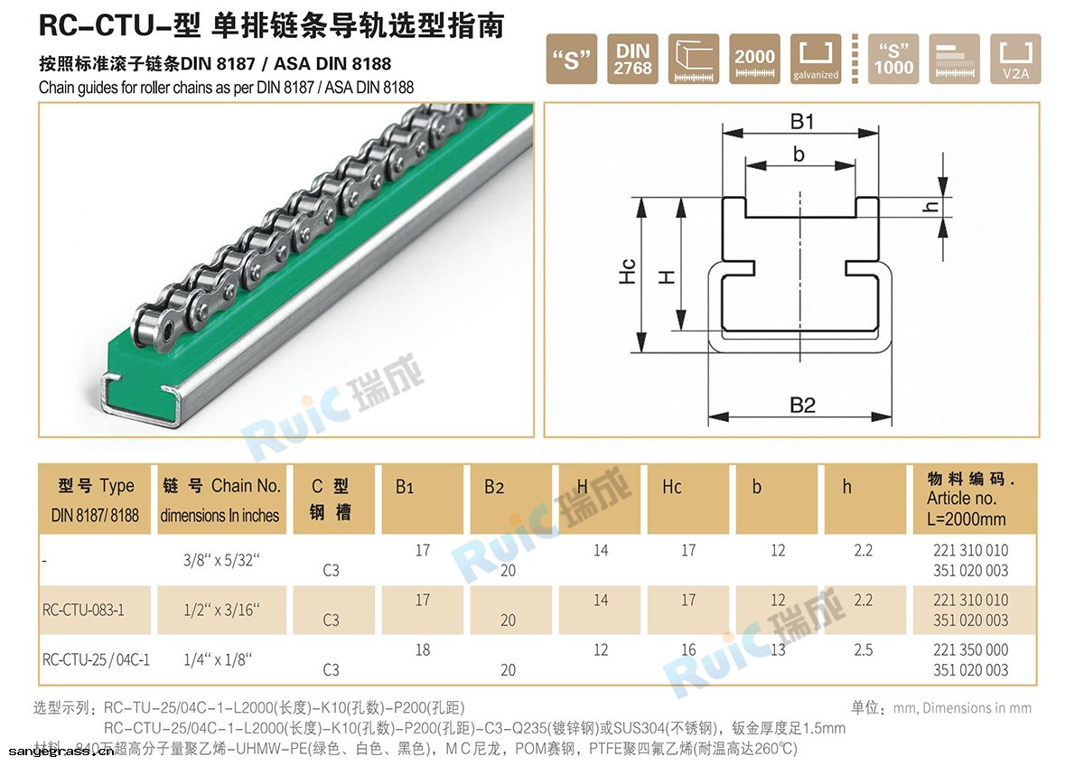 鏈條導軌-鏈條導向件 ,是(shì)一種靜壓導軌 ,用於支(zhī)撐和導向鏈條 ,減少鏈條磨擦 ,降低噪音 ,增強(qiáng)鏈條使(shǐ)用壽(shòu)命 。採用840萬超高分子量聚乙烯(xī)(UHMW-PE)生產 ,鏈條導軌具有高耐(nài)磨耐(nài)溫 ,抗(kàng)腐蝕 ,穩固 ,降噪音等高精度(dù)的(de)支(zhī)撐與導向 。
