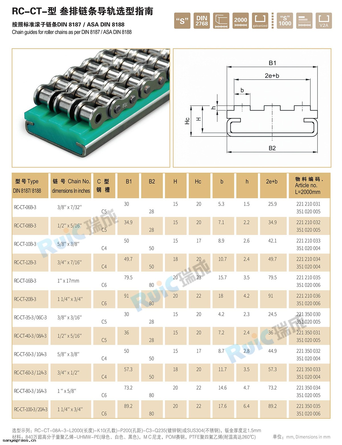 鏈條(tiáo)導軌-鏈條(tiáo)導向件 ,是一種靜壓導軌 ,用於支(zhī)撐和(hé)導向鏈條(tiáo) ,減少鏈條(tiáo)磨擦 ,降低噪音 ,增強鏈條(tiáo)使(shǐ)用壽命(mìng) 。採用840萬超高分子量聚(jù)乙烯(xī)(UHMW-PE)生產 ,鏈條(tiáo)導軌具有高耐磨耐溫 ,抗(kàng)腐蝕 ,穩固 ,降噪音等高精度(dù)的(de)支(zhī)撐與導向 。