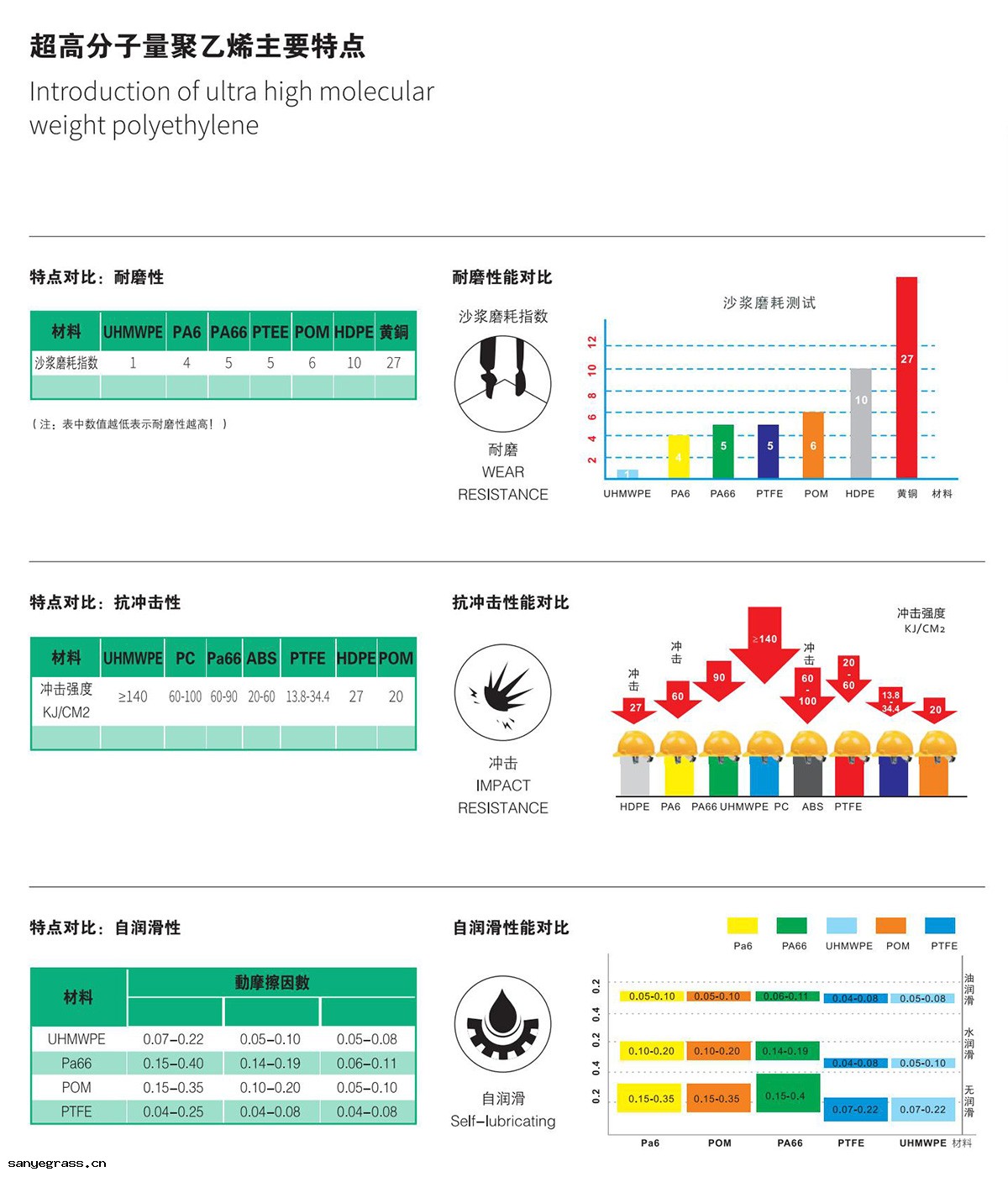 1)耐磨性極高 ,比尼龍66和聚四氟乙烯高4倍 ,比碳(tàn)鋼高6倍 ,是目前所有合成樹脂中最好(hǎo)的(de) 。