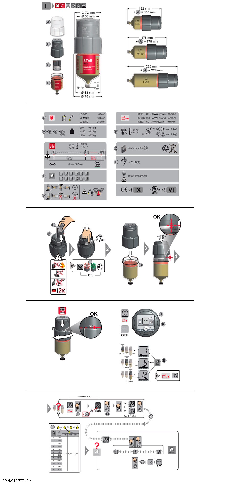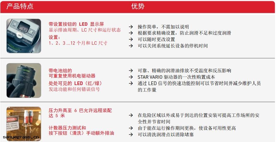 perma STAR VARIO 可(kě)用於(yú)滾柱和滑動(dòng)軸承 、滑動(dòng)導(dǎo)軌(guǐ) 、開式齒輪 、齒輪架(jià) 、絲槓 、軸密封圈和鏈(liàn)條的(de)單點(diǎn)潤滑 。由於(yú)潤滑油計 量精確 ,perma STAR VARIO 非常適合用指(zhǐ)定(dìng)的(de)潤滑油量 來潤滑電(diàn)動(dòng)機 。perma STAR VARIO 防塵和防水噴(pēn)射 ,取(qǔ)決於(yú) 各個部 件(jiàn)的(de)正確安裝 (IP 65) 。