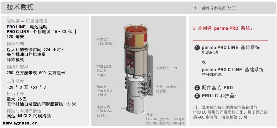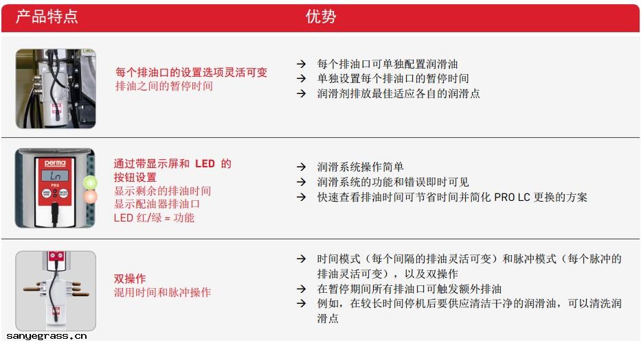 perma PRO LINE 和 perma PRO C LINE 是用於線性導軌的可變多點(diǎn)潤滑系統 。排(pái) 油可精確適應製造商的規格 。六個排(pái)油口都可以靈(líng)活設置潤滑油的數量(liàng)和再潤滑間 隔 。PRO LC 注滿 250 或 500 立方釐米的潤滑脂(zhī) 。產生的高壓使每個排(pái)油口的遠程(chéng)裝 配使用潤滑脂(zhī)管(guǎn)線長達 5 米 。這(zhè)增加(jiā)了工作場所(suǒ)的安全(chéng)性 ,同時允許對運行中的系統 進行可靠潤滑 。