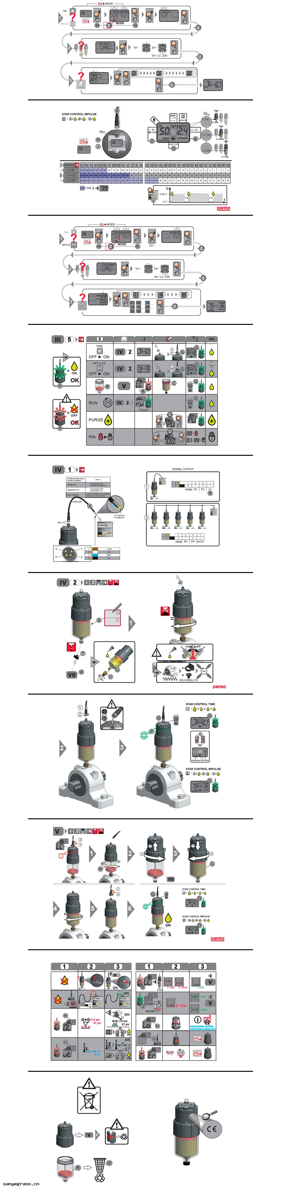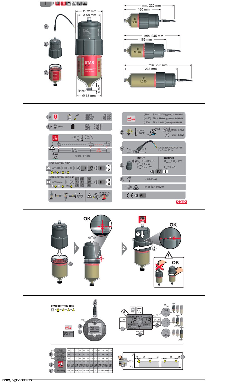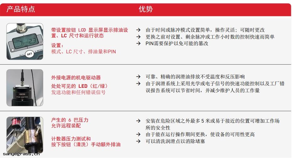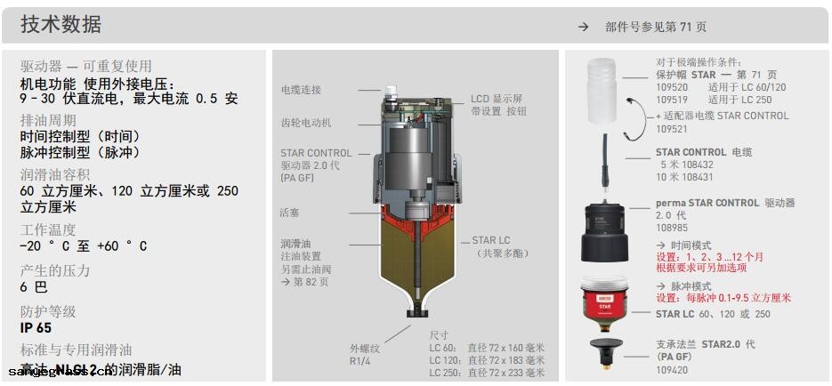與 perma STAR VARIO(帶電池(chí)組(zǔ))相比 ,perma STAR CONTROL 通過(guò)電纜供(gōng)應外部電源(yuán) 。 此外 ,運行狀(zhuàng)態可以(yǐ)通過(guò)此連接傳送到 PLC 。可靈(líng)活(huó)使用工作時間和脈衝兩種集(jí)成式(shì)操作模 式(shì) 。在時間模式(shì)下(xià) ,潤滑油分配依賴於運行小(xiǎo)時數(shù) 。在脈衝模式(shì)下(xià) ,只要接通電壓 ,就能分 配精(jīng)確定義的油量 。 perma STAR CONTROL 由機電驅動器和裝有 60 、120 或 250 立方釐米潤滑油的 LC 組(zǔ)成 。 在驅動器上設置(zhì)所需的模式(shì) 。潤滑精(jīng)確 ,不(bù)受溫度影響 ,反壓高達 6 巴 。